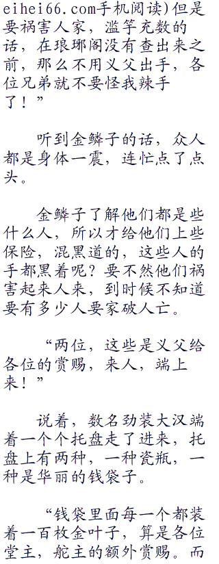 “七大堂口的兄弟,凡是这一次有功的人,每人一千两,舵主五千两,堂主一万两。剩下的则是给下面的兄弟的伙食费,各位兄弟可不要贪了!”