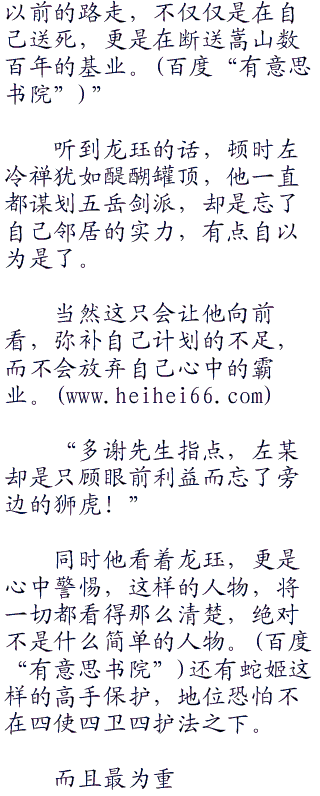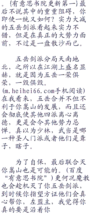 “第三,你的路错了,合并五派看起来是增加你们衡山派的实力,但是说到底,不过是自相残杀消磨五岳剑派的实力而已