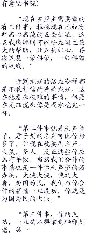 “我琅琊阁想要与贵派合作,我知道左盟主想要五岳并派,壮大自己的实力,然后吞峨眉昆仑,并少林武当,最后铲除魔教,一统江湖。”
