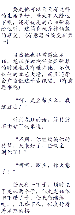 龙珏正在与任我行下棋,而任盈盈弹着龙珏交给她的广陵散,这样的安逸的画面,外面的绿竹翁羡慕不已。