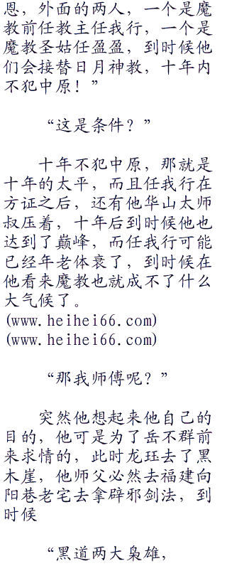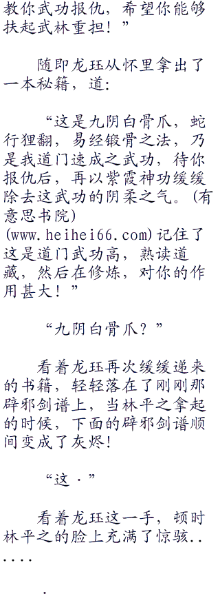 “看看你们家的武功绝学,这是我六年强抄来的,这里面由你想要知道的一切。为什么在林远图手上威震黑道的辟邪剑法到了你们祖孙三代就变得平平无奇,就是因为里面却少了其中的窍门心法,当然你要是不相信的话,你们祖祠的牌扁面后面有件袈裟,那是你远图公的遗物,记得清清楚楚!”