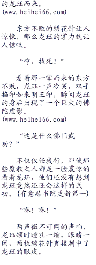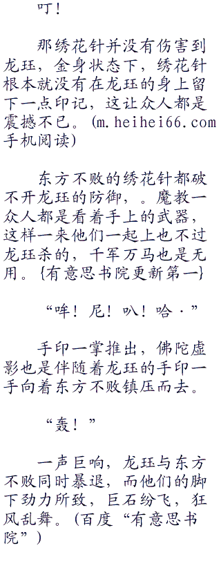 那无声无息,但是又威力惊人的绣花针放佛无穷无尽一样,众人看不清东方不败是如何发射,只听那叮叮的声音,就绣花针落下,即使任我行也不由倒吸了一口气。