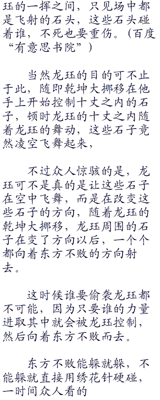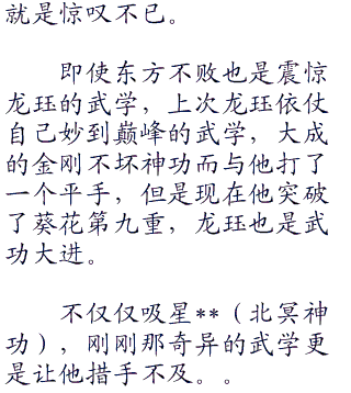 在东方不败停歇的时候,突然龙珏一掌打向了东方不败,东方不败见识过龙珏的掌力,所以连忙闪开了龙珏的一掌。