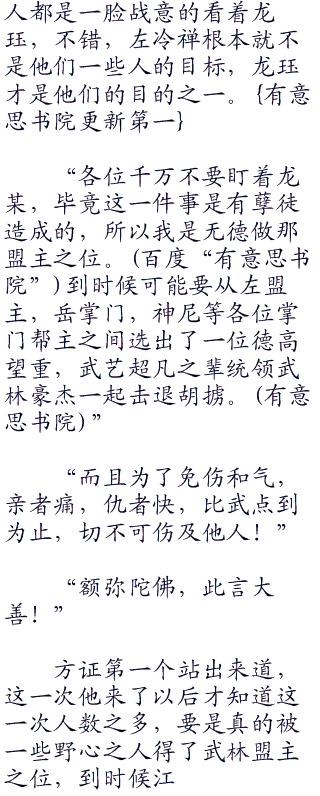 当然其中十家客栈是他安排的,少林,武当,五岳剑派,昆仑,峨眉,丐帮,金钱帮·龙珏分别给他们一派一家客栈,而且都是可容纳超过百人的大客栈。