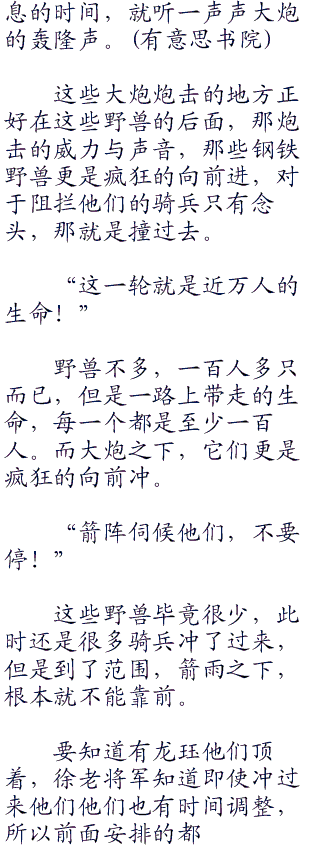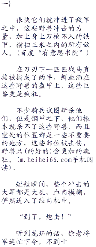 足足三列,每一列都有十个,后面还有一群穿着钢铁盔甲的猛虎,狮子,犀牛等,头上都是数个一尺长的尖刃,甲上两个翅膀一样的东西竖起,前端却是锋利无比的刀刃。