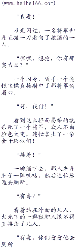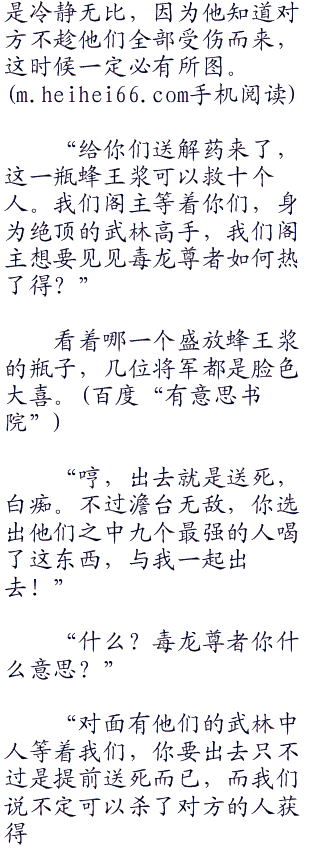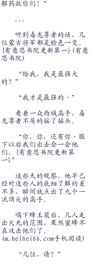 “是也不是?记不记得今天晚上喝酒的时候,酒中带有一股香甜的味道,那是一种特制的蜂蜜,这蜜蜂就是它们引来的。凡是喝了这酒的人,今天晚上都应该是这些蜜蜂的目标,有时候无毒的东西比有毒的更加可怕,防不胜防!”