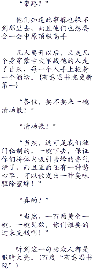 突然一道吊儿郎当的声音,只见一名身穿蒙古战袍的青年走了出来,在营中穿梭,一点也不受蜜蜂的影攻击。
