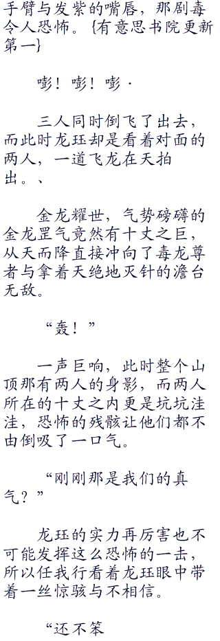 龙珏倒退三步,而毒龙尊者却是一直不断地后退,直到涯边才停下来,一口鲜血再也忍不住吐了出来。