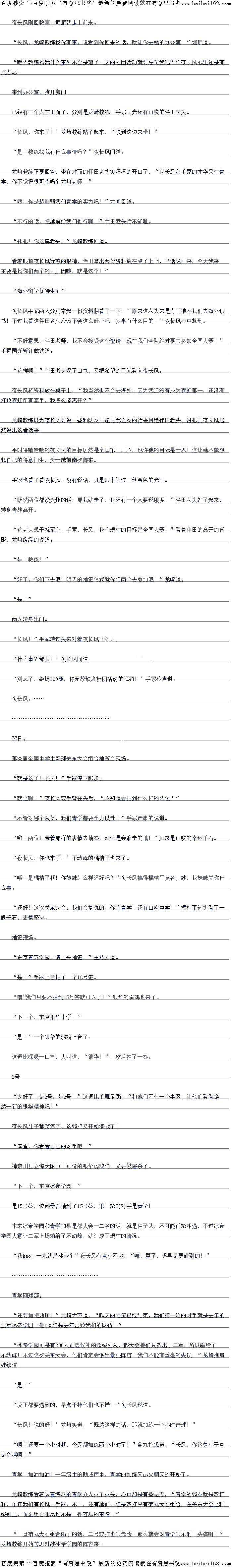 “真田弦一郎,了不起的家伙!不愧是立海大的王牌,难怪被称为是中学生网球界的NO1,这压迫力可不是随便说说的!”迹部眼中蓝光一闪,“但是,你以为本大爷是谁呢!恩?”