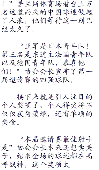 “太厉害了!他居然刚才原来是想射穿轮胎啊!”这时场外的矮个男孩激动了,他带着自己的足球,直接就飞奔跃进了足球场!