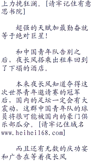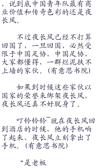 南葛的队员已经对夜长风的土豪本色麻木了,他们在知道夜长风的中国国籍后,都以为夜长风是神秘东方古国某某大能的后代,也就是传说中的超级富二代。