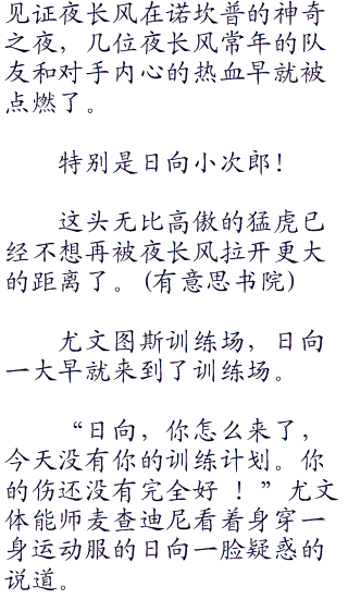 在这之后,猛虎日向小次郎还在场上不停的奔跑,他想要摆脱夜长风的看防,但是随着日向体能的下降,他的动作也开始变形了,被夜长风抓住机会,直接在日向的脚下连续两次断球。