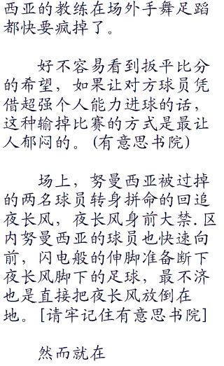 此时夜长风一个人将足球从球门中捡起,然后回到了中场摆好,现在不是强调防守的时候,时间已经不多了,夜长风必须靠一个人的力量在这个时候接管比赛。