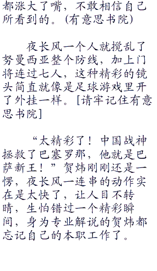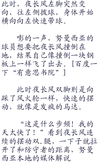夜长风本来力量就逆天,这个时候属性又提升了%之多,他踢出的足球直接向一颗导弹一般飞向修哲的球门,速度极快,一眨眼就来到了修哲的门前,一瞬间就贯穿了修哲的几条防线。