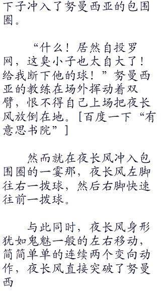 夜长风在中前场的中间很轻巧的停住了足球,面对修哲上前防守的两人,夜长风直接一个人球分过,从两人中间硬挤了过去。
