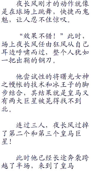 要知道夜长风身体力量本来就非常强,再加上王者无敌状态的增幅,可以说四五个明和的球员力量加起来都不一定能阻挡夜长风的脚步。