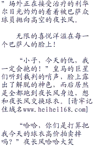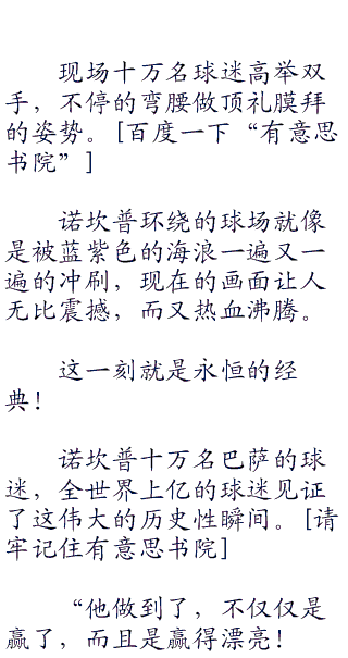 “哇!赢了!我们是冠军!”看台南葛的球迷彻底的沸腾了,整个读写球场变成了蓝白色的海洋,看台上的观众做起了人浪。
