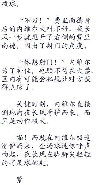 40!上半场比赛开始还不到十分钟,南葛就已经领先了,夜长风也完成恩啦本场比赛的帽子戏法,独中三球。