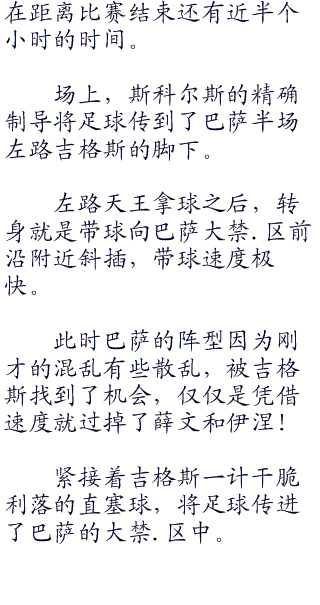 面对富良野冲上前来的三名后卫,还有身后松山光的回追,夜长风选择了传球,皮球擦着草皮,飞到了大禁.区内岬太郎的脚下。