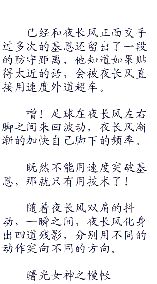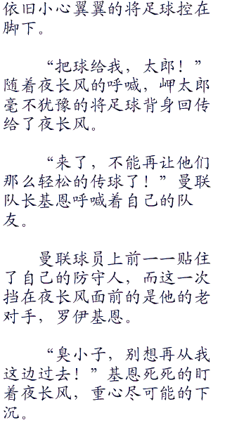 噌!夜长风已经风驰电掣般的杀入了东邦学园的大禁.区中,东邦学园的最后三名防守球员围了上来。