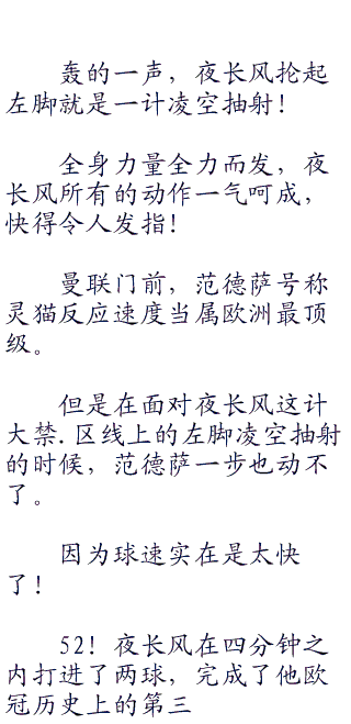 夜长风这股一往无前的气势夺人魂魄,老子就是要进球,不管你是谁,也不管你作出了怎么样的精彩扑救,我就是要进球,我就是要拿到冠军!