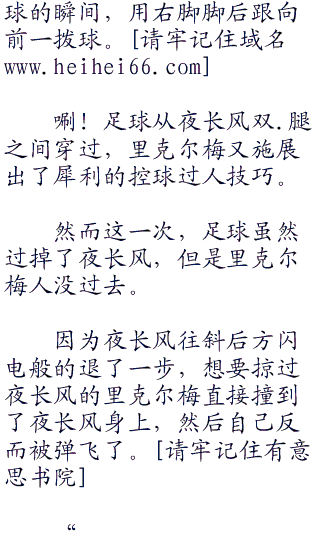 ;;;砰的一声沉闷声响,让不莱梅青年队所有球员都惊讶的是位置不利的夜长风,居然在接触的一瞬间就撞飞了不莱梅青年队的防守球员。