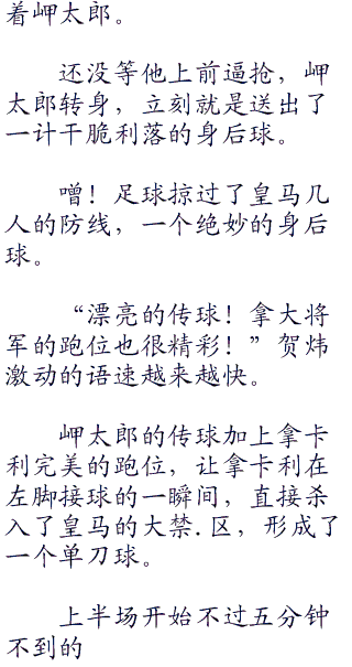 ;;;虽然夜长风没有转国籍加入日本青年队让德川正义有些失望,但是德川正义还是希望同为亚洲的中国青年队能够打出精彩比赛,让欧洲南美的列强,看看亚洲球队的厉害。