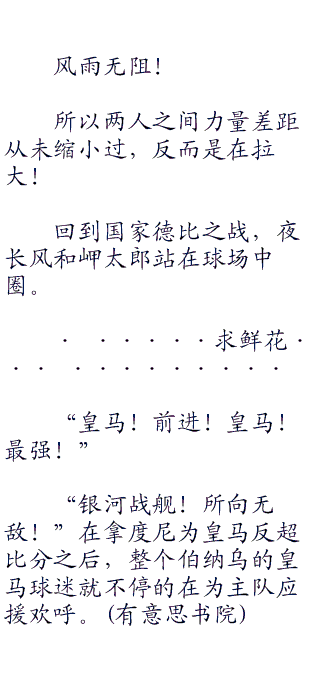 “我们上!”施奈德右手一挥,示意德国青年队中前场球员压上,这场比赛,施奈德一直陷入和夜长风个人对抗的泥潭之中。