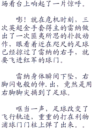 场上,钢铁巨人米勒没有受到嘘声的任何影响,上半场所剩下的时间已经不多了,他一计大脚就是将足球开向中场。