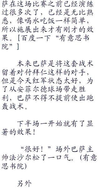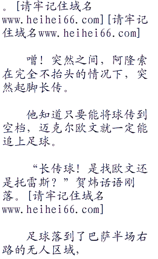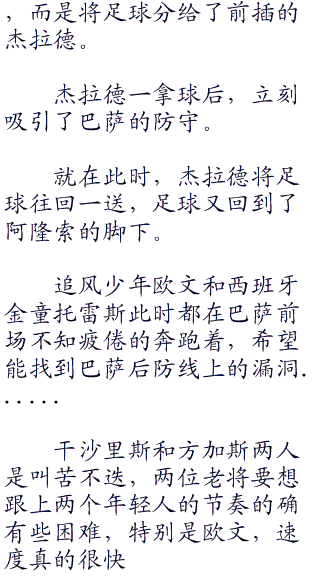 ;;;“太太精彩!观众朋友们,刚才的进球实在是太精彩了,夜长风选手一个人就搅乱了德国战车的防线,而且最后在大禁.区中用高超的技术将足球送到了队友的脚下!完美的配合!”贺炜再一阵发愣之后,回过神来,就开始吹开了。