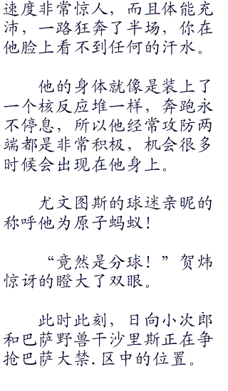 ;;;三杉淳卸下足球,人球合一,再次启动,他的面前已经没有了防守球员。
