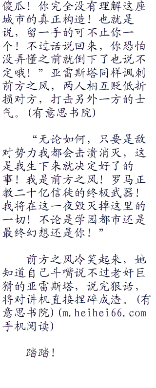 “啊呀!自己的城市状况还没有搞清楚吗?好像叫什么警备队和风纪委来着,靠这些废物杂碎保护自己,很容易掉脑袋的!你应该知道自己快完蛋了!”前方之风嘲讽道。