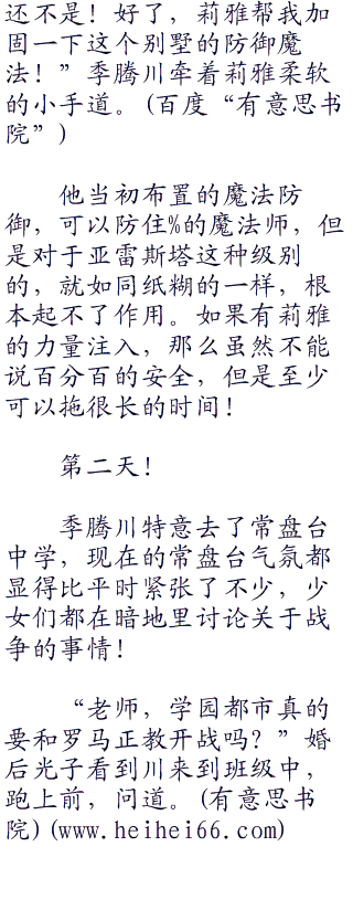 “终考取消了!都要开战了!那还顾得上考试?好了,各自回房!我还需要布置一下这里的防御!”季腾川说完起身,茵蒂克丝、御坂妹妹们起身回到各自的房间,知道现在不是打扰川的时候。