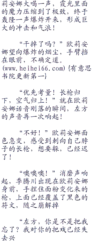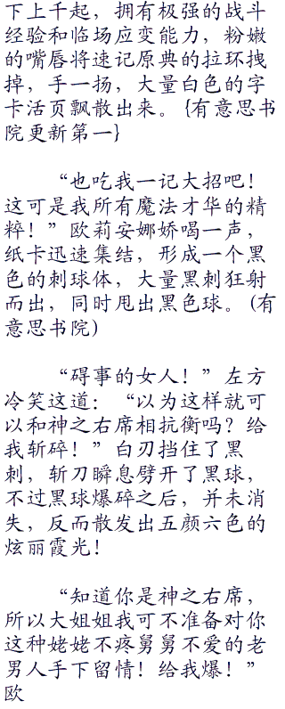 “优先考量!墙壁归下!刀刃归上!”左方的声音突然在欧莉安娜身后响起,大量的白刃飞射而来,这一次的目标是欧莉安娜!