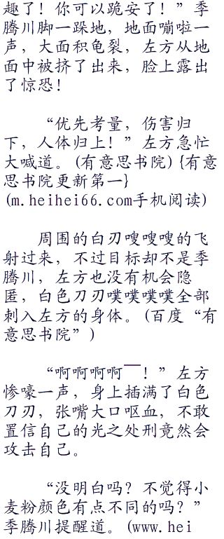 “光之处刑!左方之地!在我看来,你是神之右席中最弱的一个,你就会这点把戏吗?”季腾川一动不动,任由斩刀劈在身上,不过都被反射回去,根本没有一把能够真正伤害到川一分一毫的。
