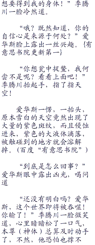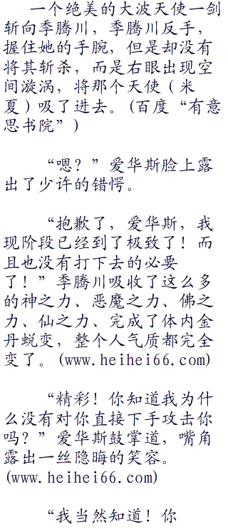 “”天堂!此刻已经打翻天了,季腾川化身为绝世战神,越战越勇,不管是天使还是魔鬼,在他手中没有一合之敌,杀‘人’如同砍瓜切菜,无数天使和恶魔尸体从天空如下雨一样坠落。
