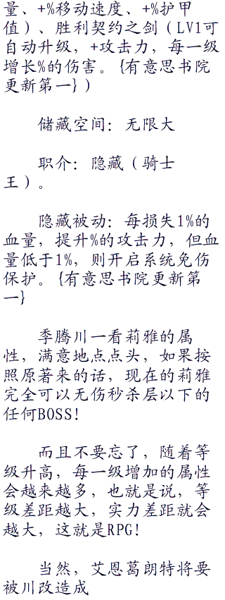 恢复速度:无限装备:魔神套装(神级装备,具有唯一性)、胜利契约之剑(攻击无限大、距离无限远,神器)储藏空间:无限大职介:圣灵骑士。