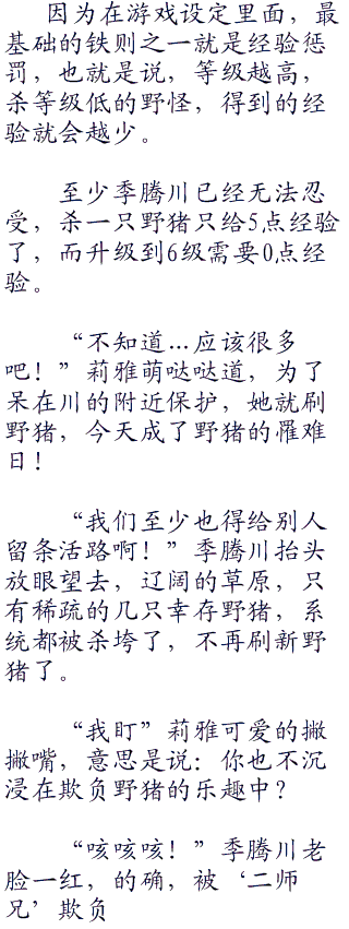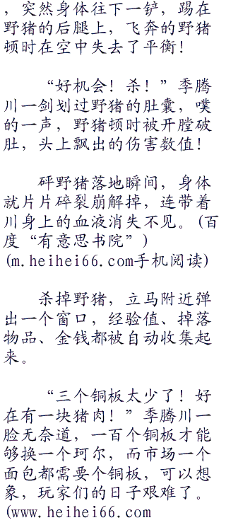 “的确,这就是游戏的魅力!现在就先拿那些野猪开刀好了!”季腾川望向不远处悠闲漫步的野猪群,拔出自己背后的铁剑,刷的一声,一挥,剑身散发出微弱的红光!系统自带技能!