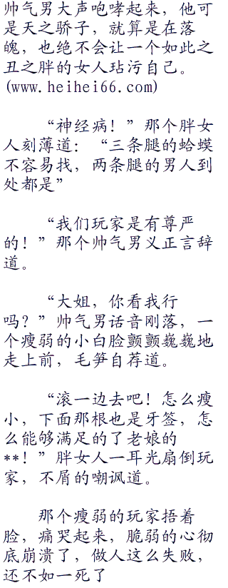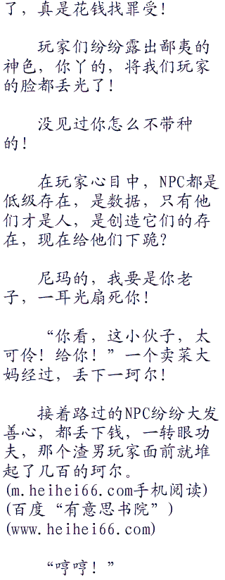 “不需要本金!”只见那个玩家突然往地上双膝一跪,可伶兮兮的大叫道:“路过经过,好心的大爷大奶奶,可伶可令我吧!我已经三天三夜没吃饭了,都快饿死了,我还有三岁的儿子也跟着饿肚子”