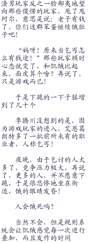 说起来,这玩家本身也是个游手好闲啥都不会的渣男,不过家庭条件挺不错的,过着富二代的生活,本来想到游戏里找刺激,现在改成要饭