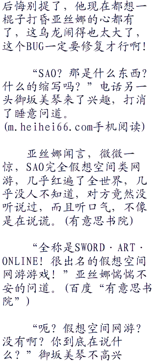 “等一下!你知道SAO吗?”亚丝娜突然问道。