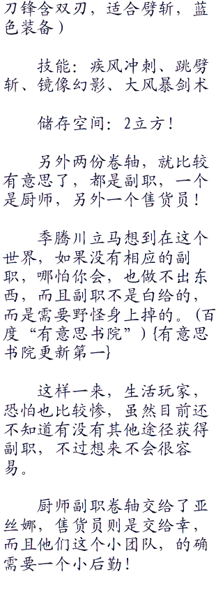 亚丝娜一下子沉默了,是的,到目前为止,不管是茅场晶彦还是那个金甲神,都没有说过游戏的玩法,甚至系统提醒都(新手手册)没有,一切都需要玩家自己去摸索,去动脑子。