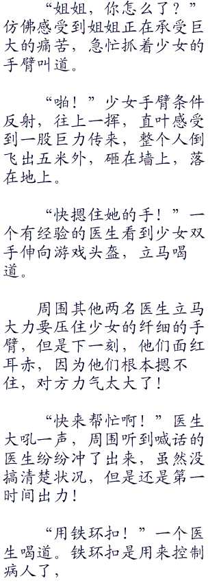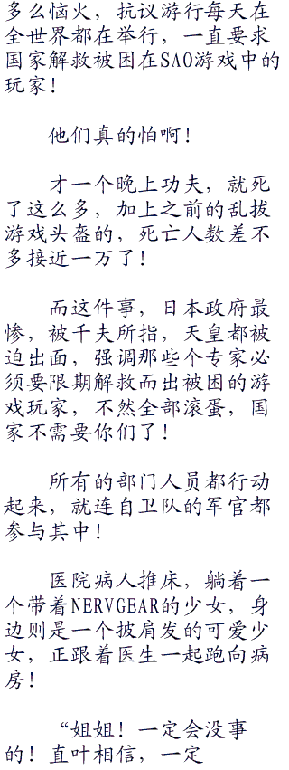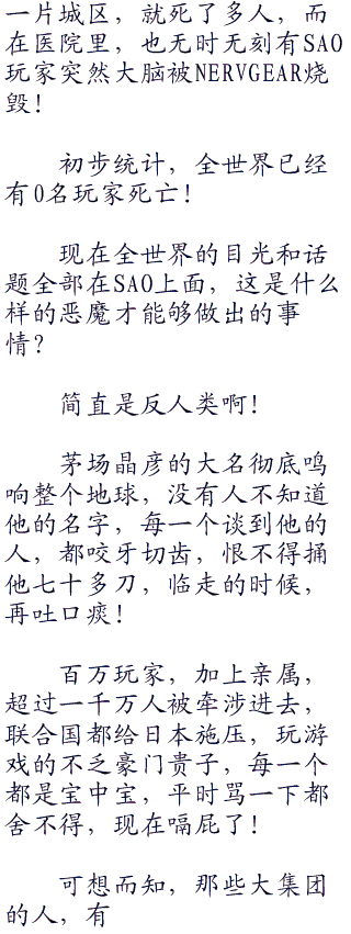 医院救护车在这一天忙个不停,附近使用NERVGEAR玩家都会被送往医院进行护理,更多的玩家,在护送的途中,大脑就被NERVGEAR烧毁,预示着,这名玩家在游戏里已经挂了!