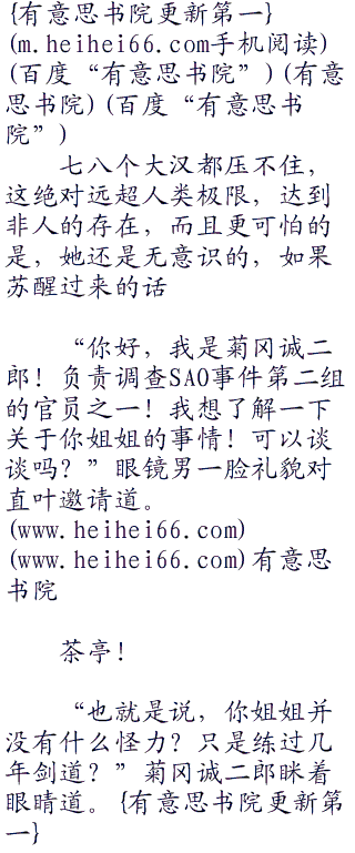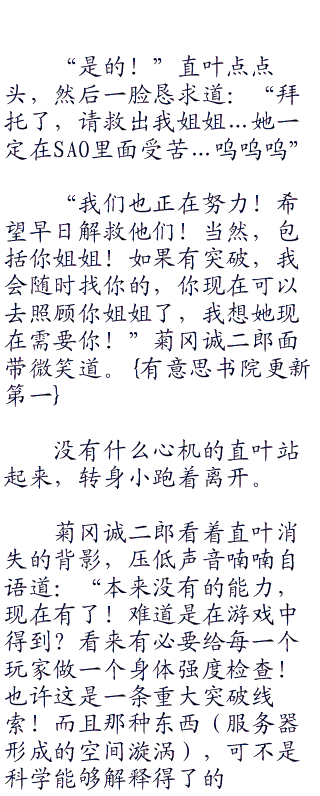 眼睛男拿出手机,查找了一个号码,拨通后道:“神代凛子,有一个SAO玩家突然出现全身痉挛、血管爆棚、甚至大吐血、心率紊乱、心脏停跳,仿佛承受巨大的痛苦,是什么情况?请务必告知!”