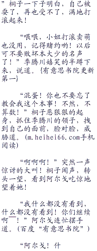 “”桐子脸都黑了,由莉耶儿则是啪的一声两脚朝天倒了下去,莉雅则是哧哧一笑,就没个正行!