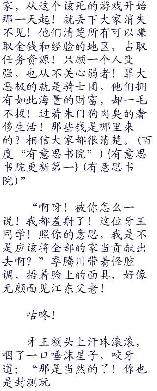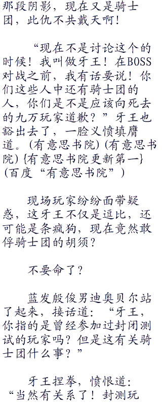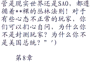 “是的,而就在前一天,我们骑士团发现了BOSS房间!这也是我为什么邀请你们来参加的原因!我们是为了全体玩家能够早日脱离这个游戏而奋斗!抛头颅洒热血!为了早日通关,离开这个游戏世界,早日和现实中的亲人团聚而努力!是这样吗?诸位!”