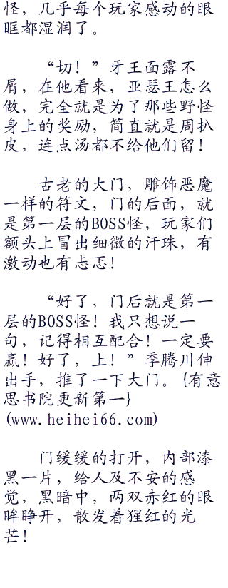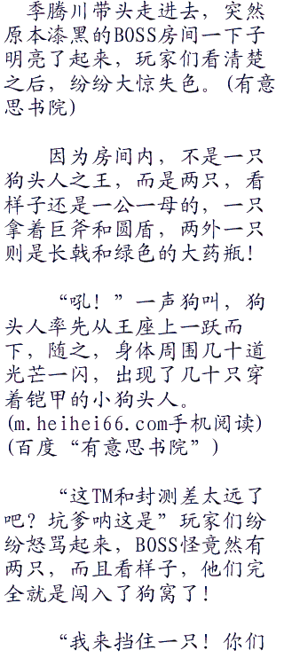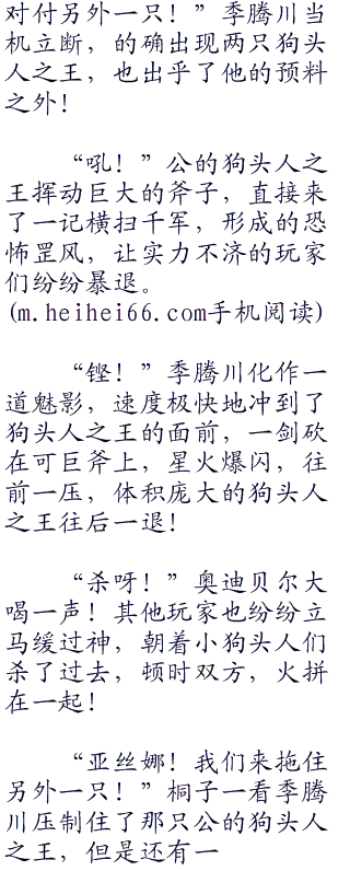 “好了,现在讨论一下BOSS怪的事情,狗头人之王!四条HP,还有狗头人护卫!至于武器什么的,就不介绍了!因为变动极大!只能临场变更战术!干掉BOSS怪,珂尔大家均分,经验则是归击杀狗头人之王的团队!至于掉落的装备!看人品!谁得归谁!明天一早,在此集合!还有问题吗?”季腾川语速极快道。