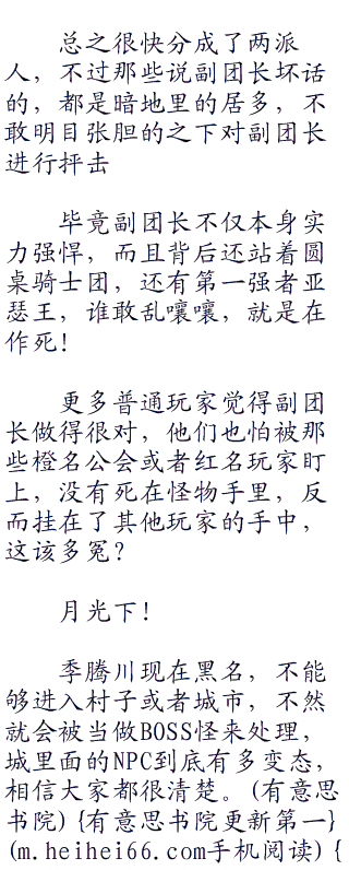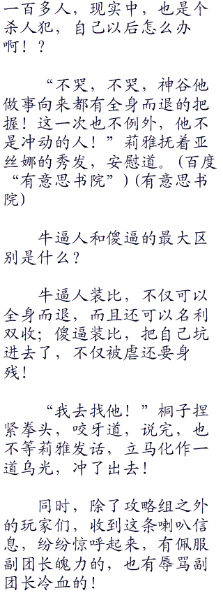 由莉耶儿一听理解川的苦心,但却觉得不值啊!诚如副团长说的,他们都是毒瘤,可是一旦SAO通关之后,越南绝对会找副团长算账的,一百多条人命,绝对够判死刑了!