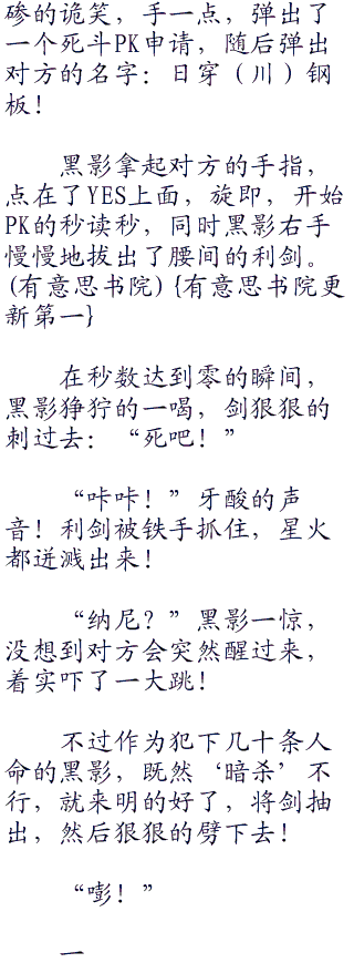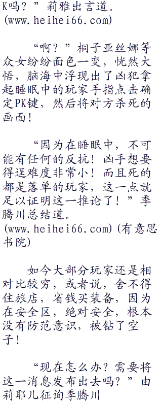 “恩!”季腾川点了点头,严肃道:“因为现在橙名和红名的风险太大,所以有一些心思不正的玩家想出了新的办法,不必担负橙名或者红名风险,照样也可以杀死玩家,夺走他们的财务和装备!”