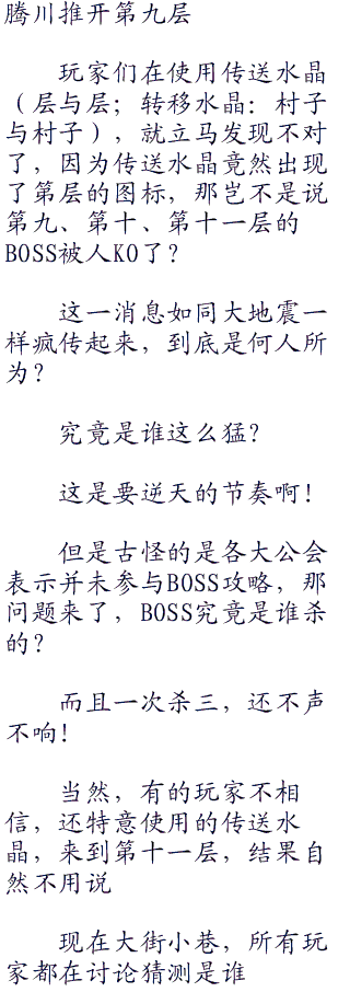 记得他自己攻略第八层房间BOSS,几十个玩家外加桐子这个主力,可是苦战了三分钟,牺牲了六个玩家,最终才耗死BOSS的!